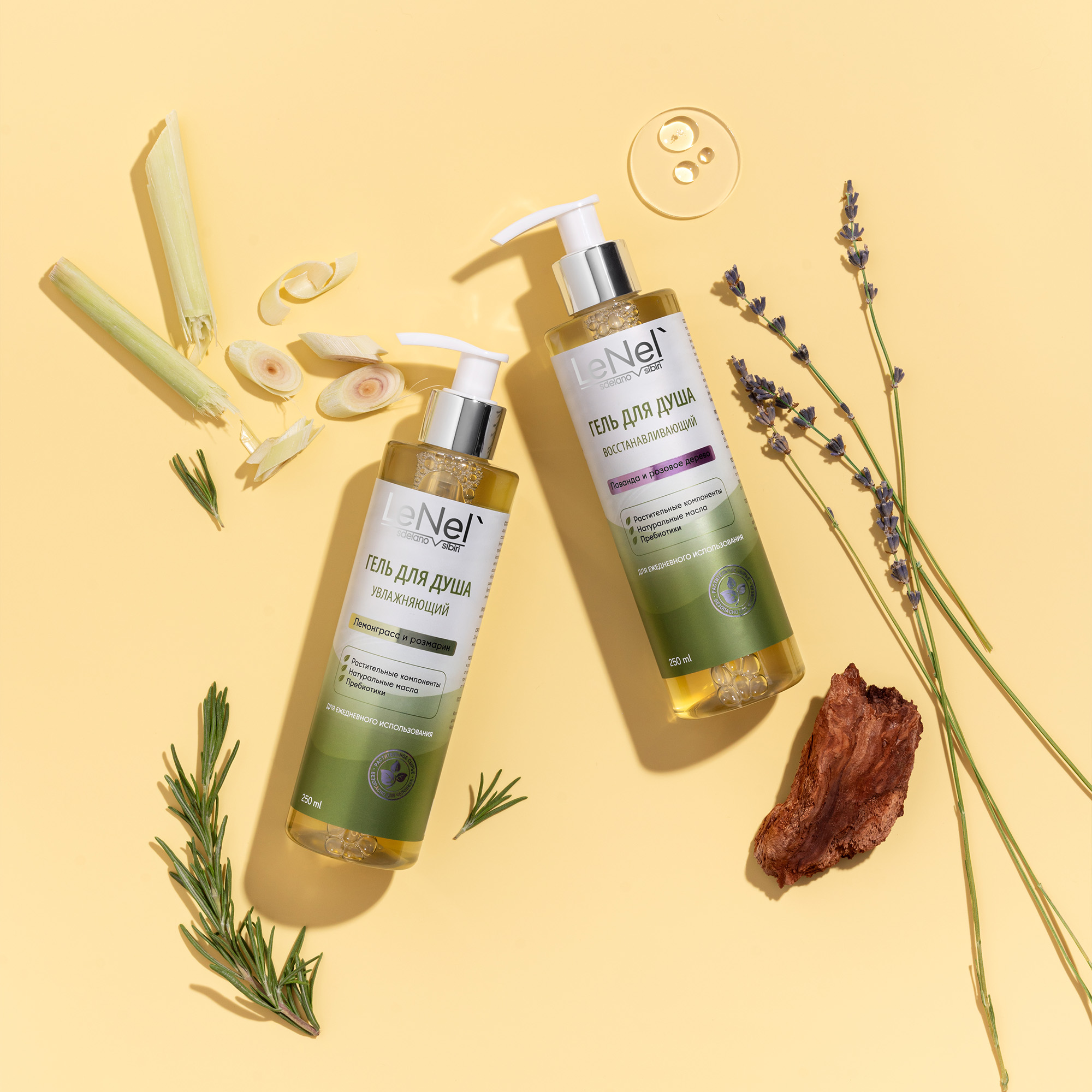 Увлажняющий гель для душа «Лемонграсс и розмарин»: Aqua (вода), Coco-Sulfate (коко-сульфат), Coco-Glucoside (коко-глюкозид), Cocamidopropyl Betaine (кокамидопропилбетаин), Glycerin (глицерин), Urea (мочевина), Betaine (бетаин), Inulin (инулин), Alpha-Glucan Oligosaccharide (альфа-глюкановый олигосахарид), Lactobacillus (лактобактерии), Calendula Officinalis Flower Extract (экстракт цветков календулы лекарственной), Benzyl Alcohol (бензиловый спирт), Ethylhexylglycerin (этилгексилглицерин), Rosmarinus Officinalis Oil (эфирное масло розмарина), Cymbopogon Citratus Essential Oil (эфирное масло лемонграсса)..